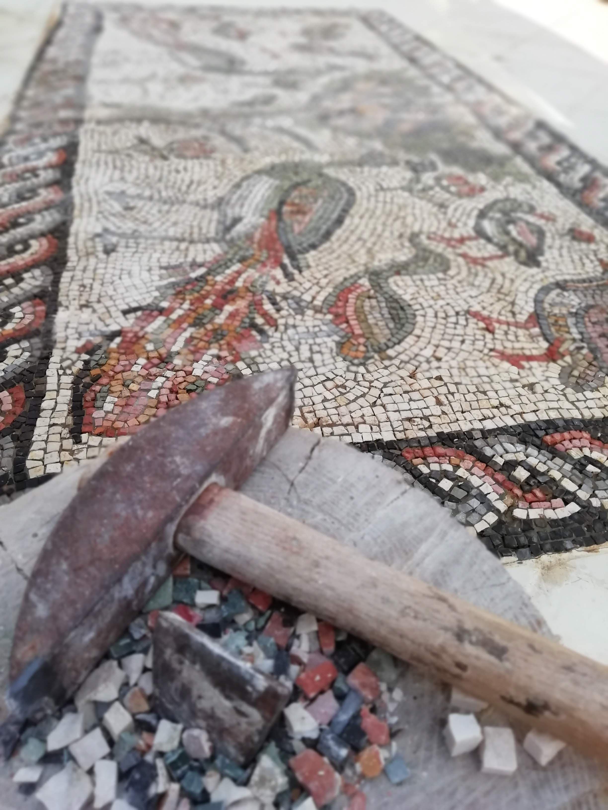 Mes premiers pas dans la restauration de mosaïque sont effectués avec une entreprise italienne spécialisée, tout en peaufinant ma formation de mosaïque à l'École pour Artisans de Turin.